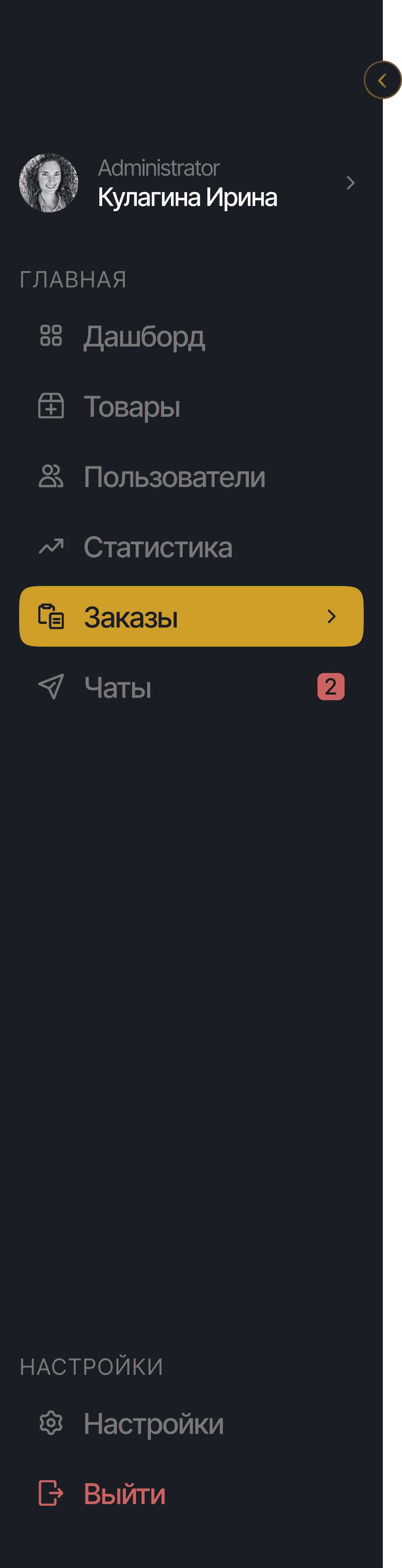 Особое внимание было уделено структуре меню. Мы переработали его с нуля, оставив только основные разделы: дашборд, товары, пользователи, статистика, заказы и чаты.