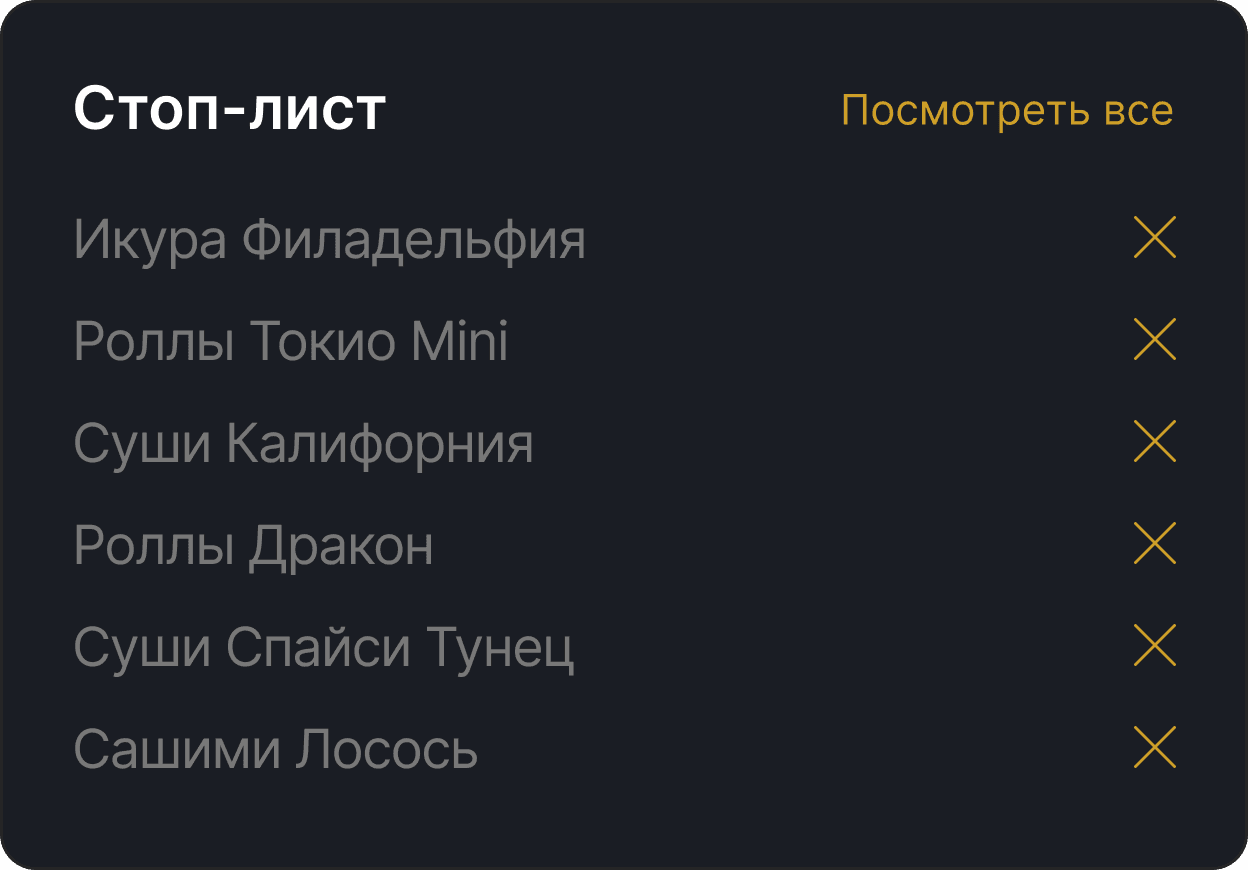 Возможность мгновенно скрывать позиции через стоп-лист сделала процесс управления ассортиментом гибким и интуитивным.