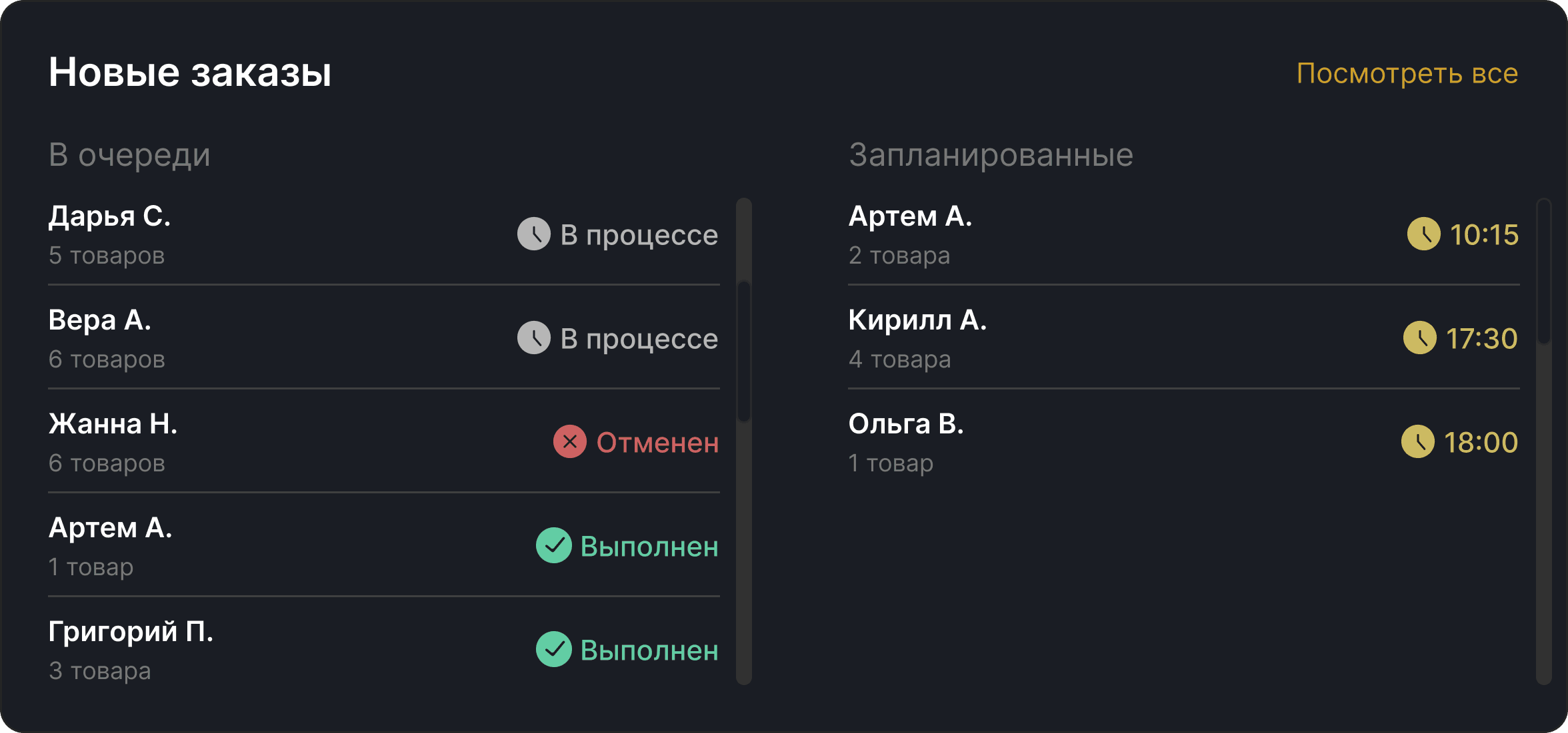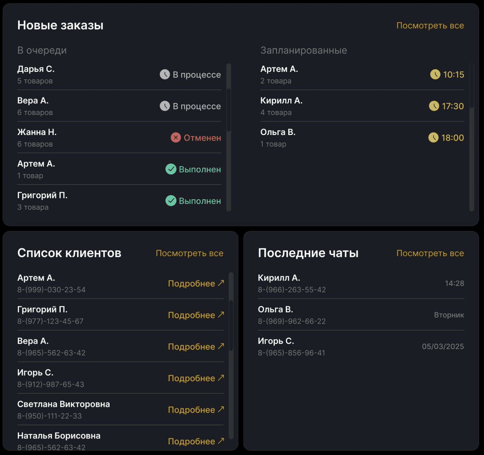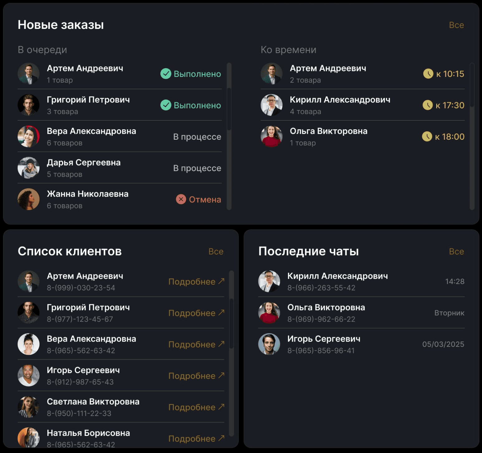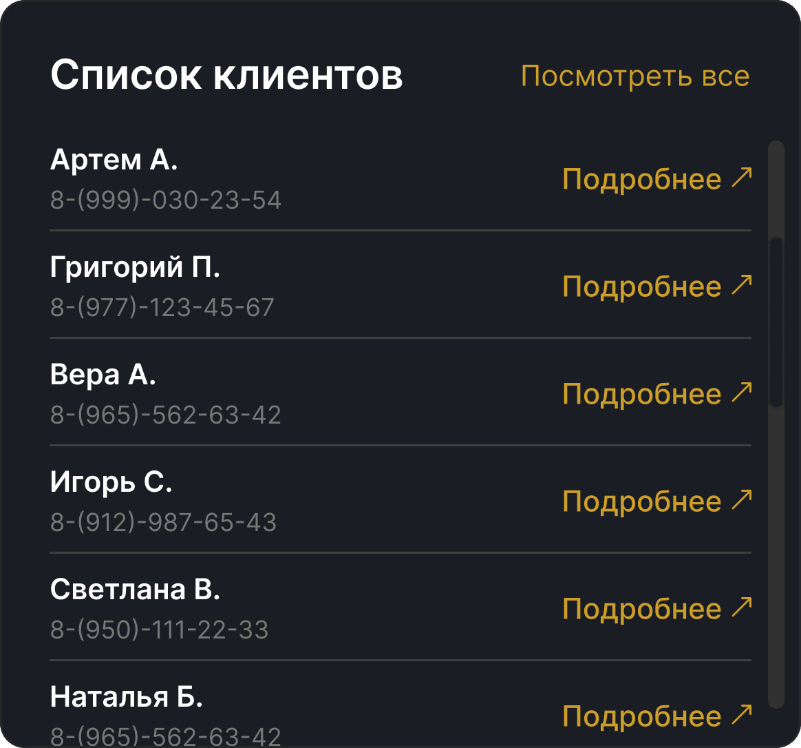 Мы переработали структуру с акцентом на приоритетные действия, убрали визуальный шум и усилили контраст ключевых данных, а также удалили неиспользуемые элементы, такие как фото клиентов и пустые поля.