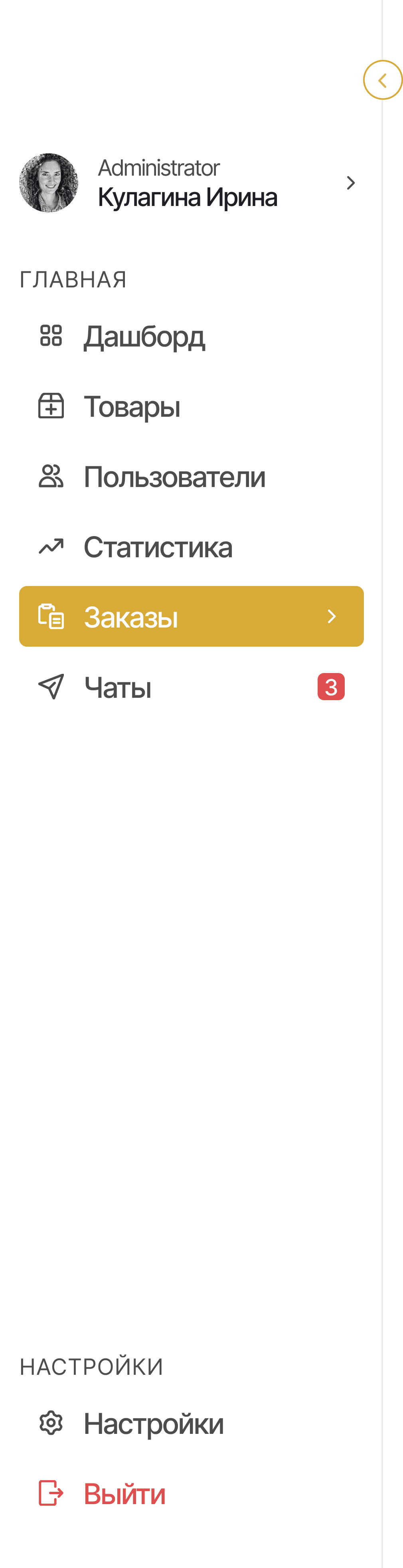 Особое внимание было уделено структуре меню. Мы переработали его с нуля, оставив только основные разделы: дашборд, товары, пользователи, статистика, заказы и чаты.