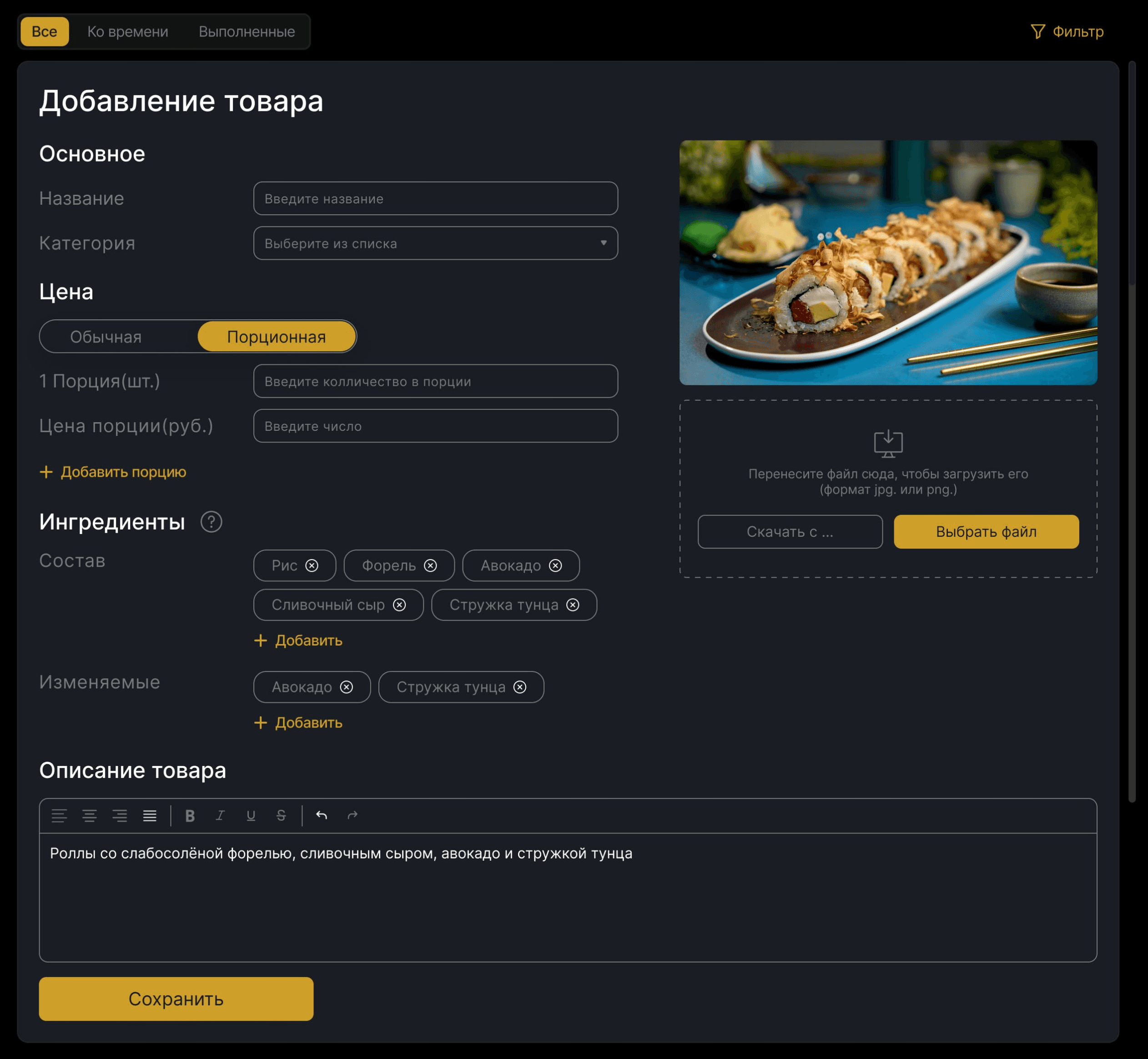 Интерфейс для работы с позициями, категориями и ингредиентами был переработан с прицелом на скорость и удобство.