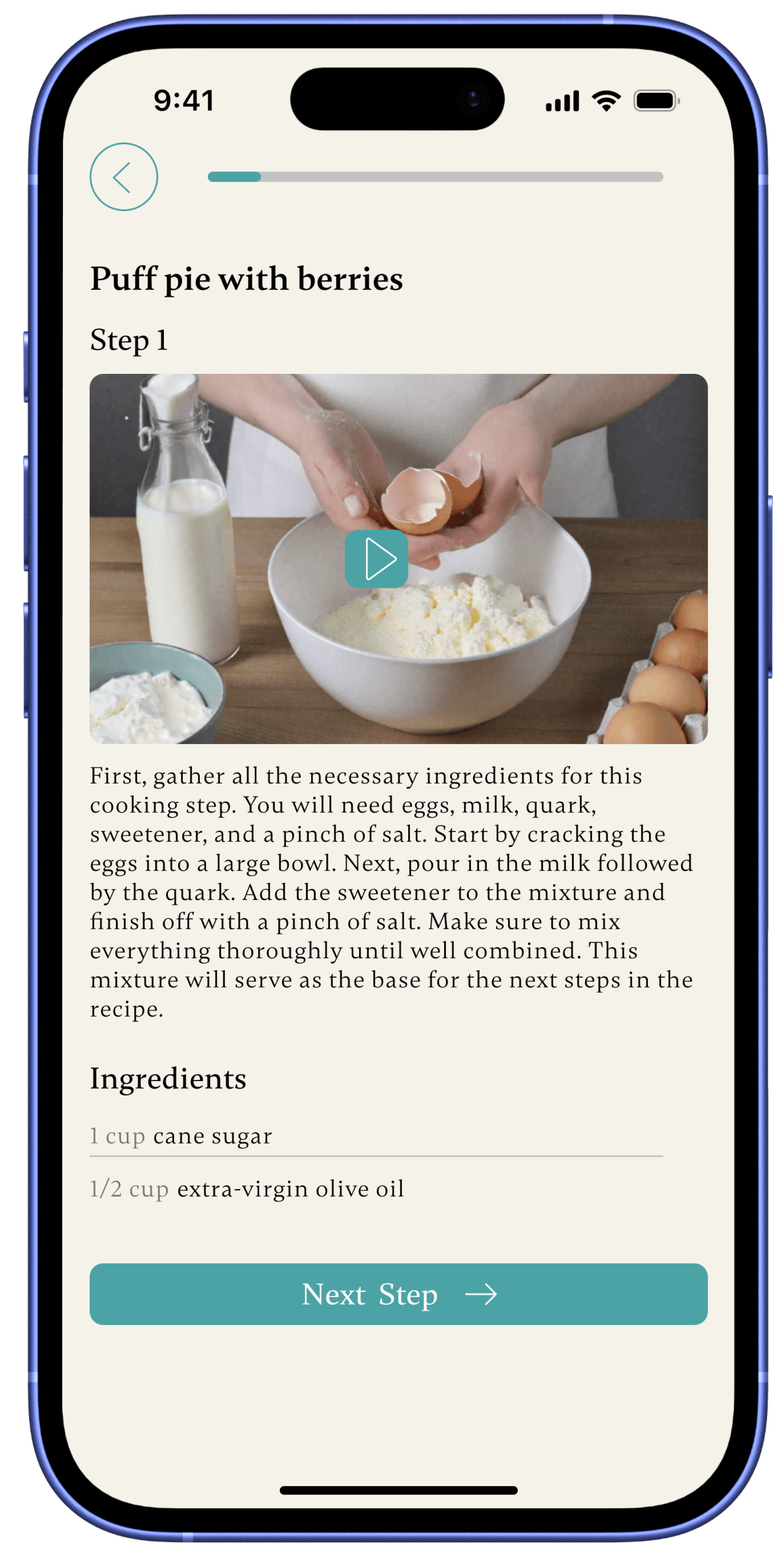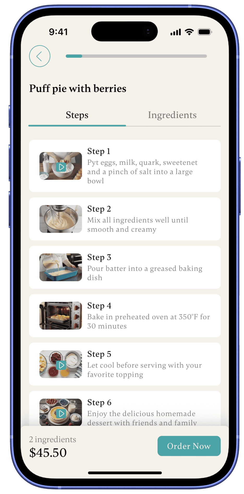 Режим пошагового приготовления делает процесс готовки проще и нагляднее. Каждый шаг сопровождается коротким видео и понятными инструкциями.