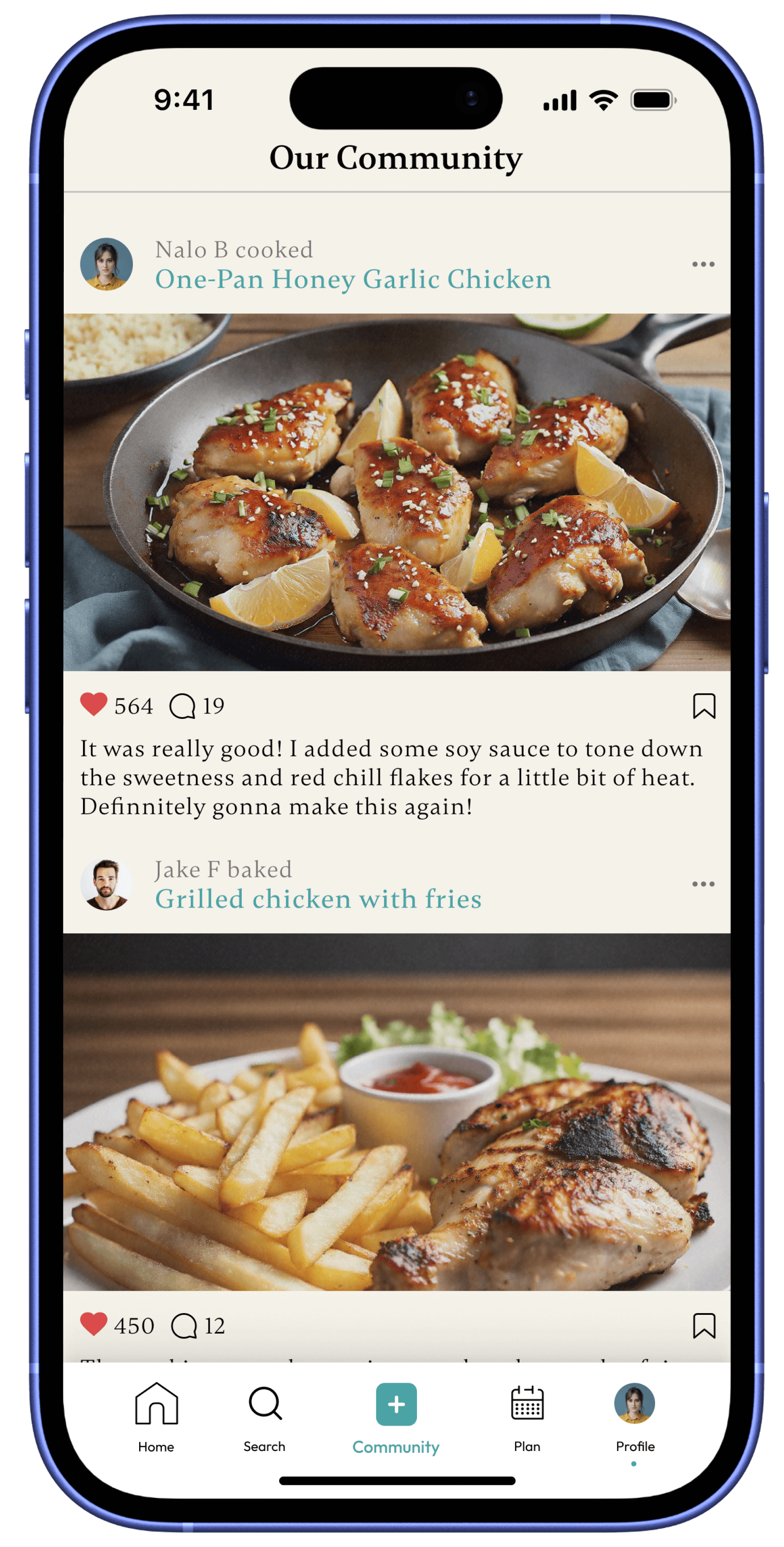 Страница сообщества — пространство для обмена рецептами, просмотра идей других пользователей и взаимодействия с кулинарным комьюнити. Здесь есть пользовательский контент и система оценок.