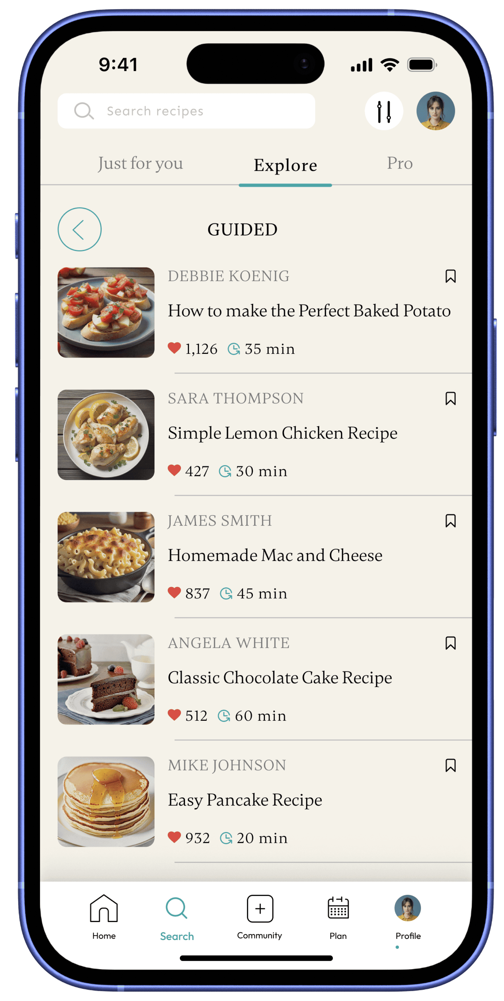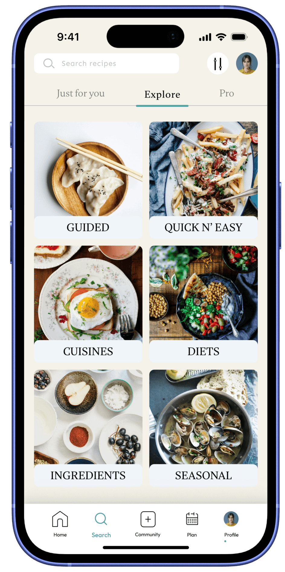 Страница поиска создана для удобного открытия новых рецептов. Она включает разделы с категориями, персонализированные рекомендации и мощную строку поиска с расширенными фильтрами. Благодаря этому пользователи могут находить рецепты по ингредиентам, диетическим предпочтениям, времени приготовления и другим параметрам.